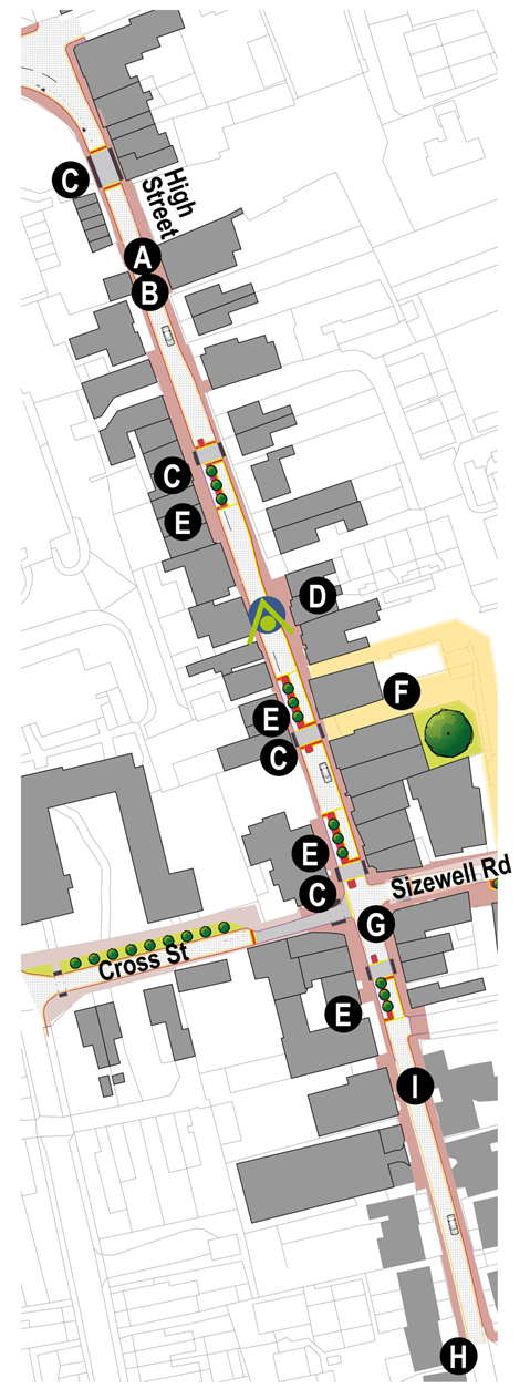 G. The High Street / Sizewell Road / Cross Street junction will be modified to restrict westbound access for vehicles into Cross Street except buses and emergency vehicles. Vehicular access will be provided into Cross Street from the west at the Park Hill / Cross Street and Central Road / Platers Walk junctions.